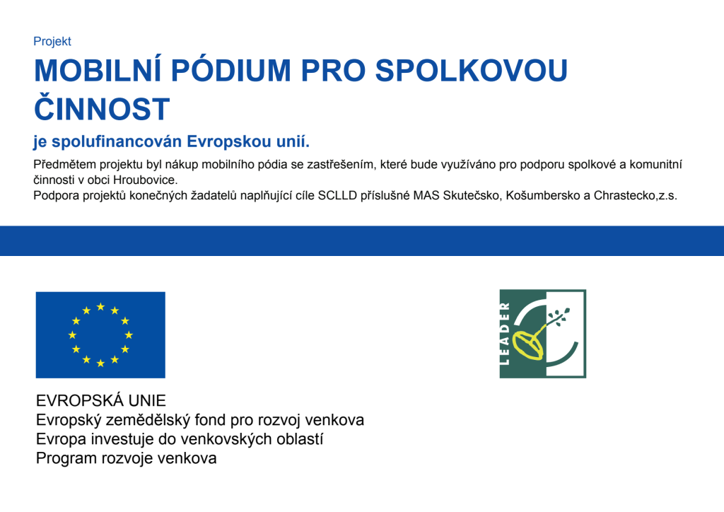 Předmětem projektu byl nákup mobilního pódia se zastřešením, které bude využíváno pro podporu komunitní a spolkové činnosti v obci Hroubovice.